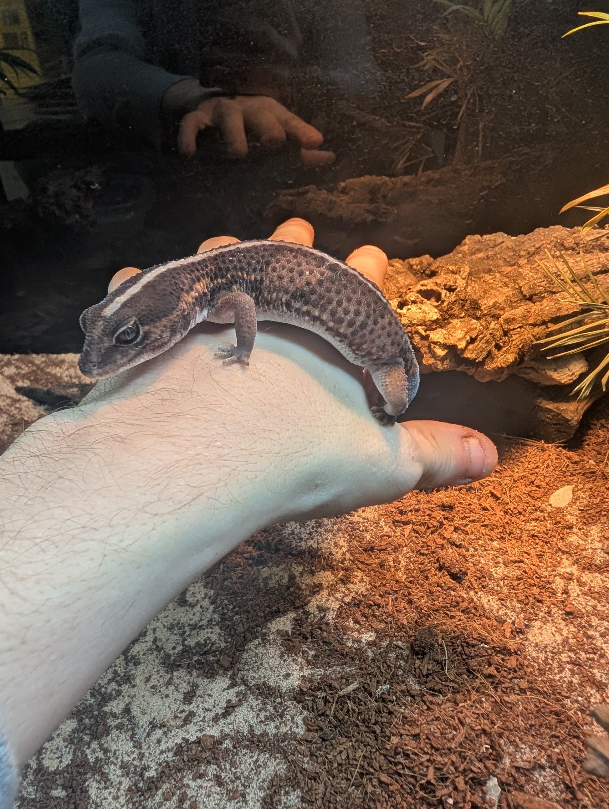 A lesser known relative to leopard geckos, fat tailed geckos have a great personality and an amazing pattern. Being an arid species African Fat Tailed geckos prefer a warmer, dry environment with humidity ranging from 50%-65% and a 90-95f degree basking spot and a 75-85f cooler side. Currently eating crickets, mealworms and silkworms.